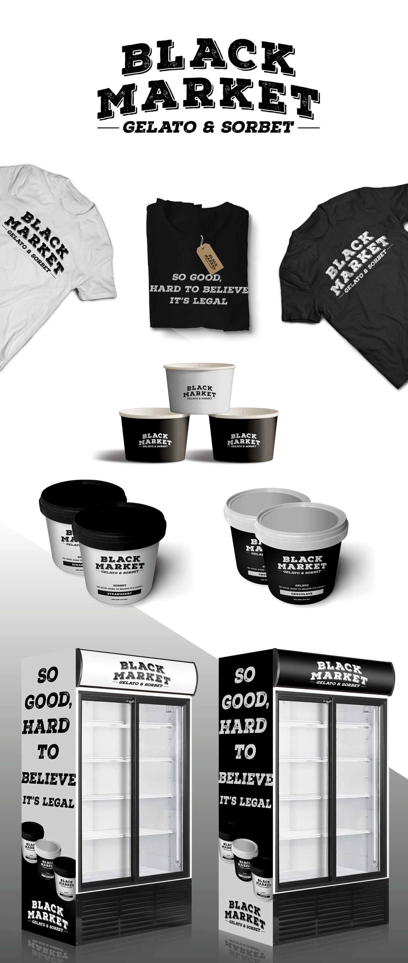 The goal of this project was to create a new logo for Black Market. Branding collateral and fridge ads were used to showcase the logo in various ways.