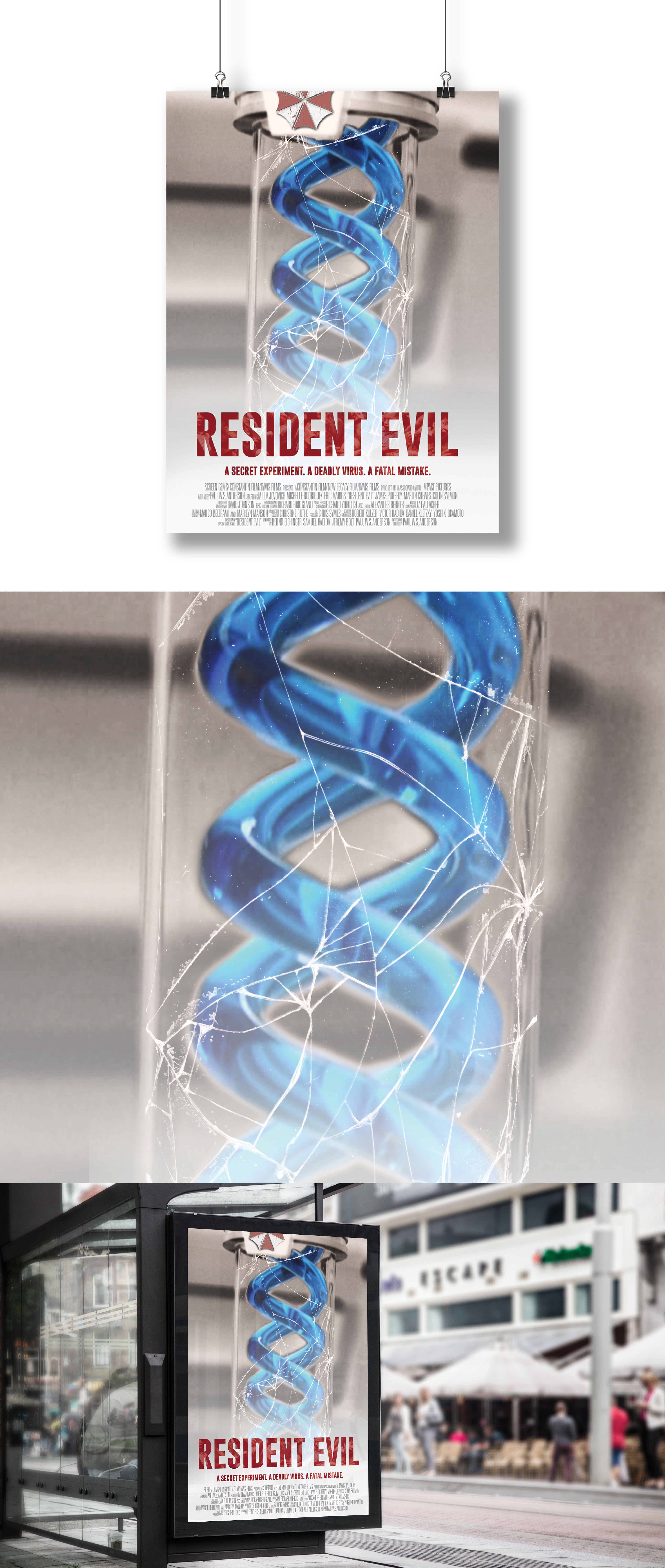 The goal of this project was to create key art for Resident Evil with billing. The key art is a dangerous virus vial cracked inside this clean white lab. The key art is showcased as a bus stop ad.